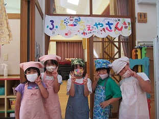今年度初めてのレストラン給食には乙狩の方々をお招きしました。各クラスに2、3人づつ入って給食を食べていただいてから、支援棟でお茶会を行いました。浴衣に着替えた年長児は「まぁ、かわいい」といってもらうとはにかみながらも笑顔がほころんだところで上井先生からお辞儀の仕方と大切さを教えていただきました。その後に緊張しながらも覚えたてのお運びとお辞儀を上手にし、「ありがとう」「美味しかったよ」と声をかけてもらいうれしそうに戻ってきました。お客様を送った後に子どもたちも和菓子とお抹茶をいただきましたが、「にがい!!」と驚いていました。あと3回あるレストラン給食を通して地域のおじいちゃん、おばあちゃんと楽しい時間を過ごしていこうね。お世話をしてくださった民生委員さん、福祉委員さんありがとうございました。