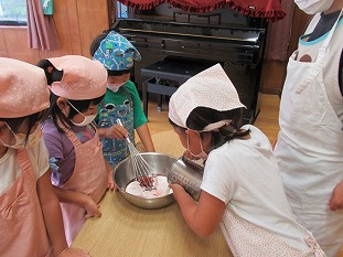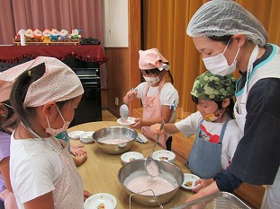午前中にひなまつり会を行い、午後からホットケーキ作りをしました。先ず、卵を割り、牛乳と粉を混ぜ、ホットプレートにそっと生地を置き、「焼けたかな?」「まだまだ」と言いながら何度もひっくり返し焼きあがった時には大喜び!生クリームといちごでトッピングをして出来上がり!!みんなで作ったホットケーキはとても美味しかったね(^^♪