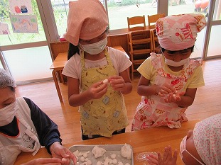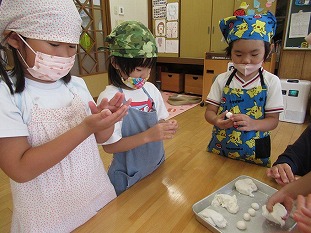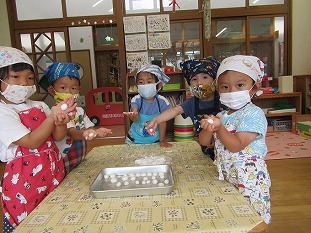 午後から3歳以上児が月見団子を作りました。小さな手のひらで丸めたお団子を「じょうずでしょ!」と得意げにみせる子ども達。