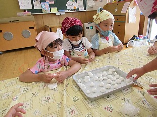 年長児が裏山で摘んだよもぎでお団子を作りました。午前中に年長児がよもぎをすり鉢で擦り、午後から3歳以上児が米粉とよもぎを混ぜ合わせて団子を丸めました。先生が粉を練っていると子ども達がそのボールを必死で押さえたり、かわいい手で一生懸命丸めたりしてできたたくさんのお団子を給食室で蒸してもらい、おやつの時間にきな粉をつけておいしく頂きました。