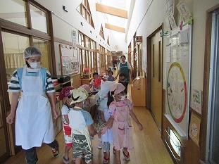 11日の午後から上牧公民館で、地域の方々にだんごと味噌だれを作っていただき、12日の午前中に年長児がだんごを串刺ししました。午後からは地域の方々にその五平餅を焼いていただき、みんなでおやつに食べました。五平餅を焼く匂いに誘われて何度も見にくる子、「もう焼けたかな?」と話し合う子など、ワクワクしながら待ちました。とうとう焼き上がり、五平餅をもらうと「ありがとう」と言って嬉しそうにお部屋に戻り美味しそうに食べました。おかわりもいっぱいしました。地域の皆様どうもありがとうございました。