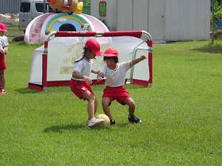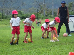 降り注ぐ太陽の下、むねっち先生と3歳以上児がサッカー教室を楽しみました。最初はダラーを使って走ったり、跳んだりして足先を動かす練習をしたり、ボールを放り上げてキャッチする練習をしました。その後に2チームに分かれて試合をしました。必死でボールを追いかけて蹴ったり、ゴールキーパーになったりして戦いました。終わった後はいっぱい汗をかいた服を着替えながら「たのしかったね」「もっとやりたかった」と話していました。