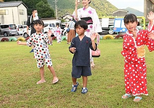 今年の夕涼み会も、浴衣や甚平姿の園児と保護者・地域の方が大勢参加してくださいました。最初に園児達がやぐらを囲んで輪になり、年長児は順番にやぐらに上がり盆踊りを踊りました。その後、夜祭風情が始まると、保育園のゲームコーナーや保護者会のバザーに園児や地域の方々がたくさん並び、どこもかしこも大賑わいでした。最後に園庭からのカウントダウンの声に合わせて、夜空に「ヒュ~・ドーン」と大きな打上花火が上がると、見上げる方々からは大きな歓声が上がり、「きれいだったね」「大きかったね」と、みんなが大満足の夕涼み会でした。(^O^)