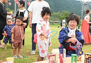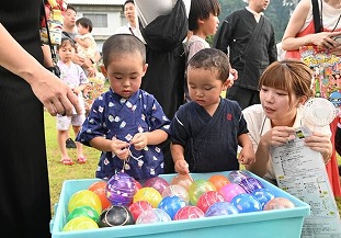 夕方から浴衣や甚平姿の園児と保護者、地域の方々が集まり夕涼み会を行いました。しか・りす・ひよこ組が輪になり、年長児はやぐらの上で盆踊りが始まりました。その後、保育園のゲームコーナーや保護者会のバザーでは、園児の他に地域の方々の参加もあり、夜祭風情も賑いました。最後はみんなでカウントダウンをして保育園の園庭から夜空に上がる大きな打ち上げ花火を楽しみました。「たのしかったね」「花火がきれいだったね」と帰っていかれました。