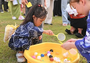 前日から準備した各クラスのお店屋さんが並び、保育室の廊下は商店街となりました。手作りの食料品をはじめ、アクセサリーやドレスなどが所狭しと並び、子どもたちは何を買おうかと目を輝かせていました。「いらっしゃい、いらっしゃい」「これください」「ありがとうございました」などの掛け声が飛び交い、商店街は大賑わい。お菓子つかみ取りのコーナーでは手をいっぱいに広げて頑張り、支援センターの神社では真剣にお詣りをする姿が見られたり、お買い物ごっこを十分楽しんだ子ども達でした。