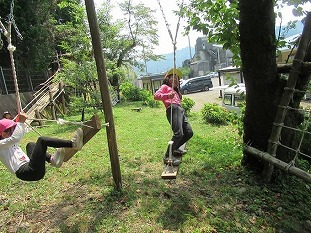 雲梯に登り、楽しくおしゃべりをする子、木のおうちをあじさいで飾っておままごとをする子たち、回転遊具をみんなで勢いよく廻している子、ブランコを