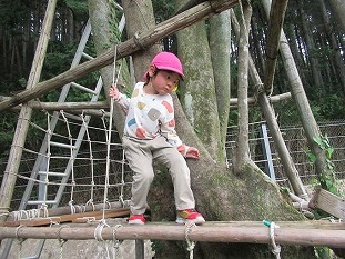 年長児が初めての森遊びを体験しました。まずは石や枝などを拾い、足元をきれいにし、次は森の神様(その日に決めた木)に手をあて「無事に森遊びができますように」とお願いをしました。その後は仙人とちこちゃんが作ってくれたブランコやシューター、ロープ渡りなどに果敢に挑戦するみんなから楽しさが伝わってくる笑顔でした。