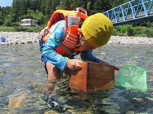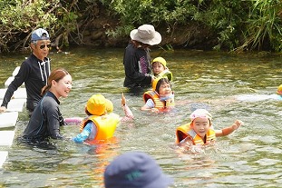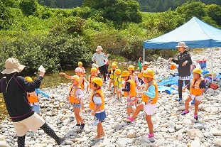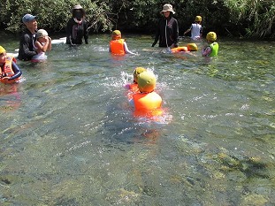 上牧橋の下でまつみ保育園の年長児と牧谷保育園の3歳以上児が一緒に川遊びを楽しみました。準備運動をして水に入った時は「つめたーい」といっていた子どもたちですが、すぐに慣れ、箱メガネで魚を探して網で捕まえたり、ちょっと深いところまで泳いでみたりと、それぞれの遊びを楽しみました。帰る時間になると「まだ、かえりたくない!」と名残惜しそうでしたが「また、遊ぼうね。さようなら!」とそれぞれの保育園バスに乗り、帰りました。とてもたのしかったね(*^-^*)