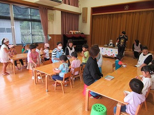 園児と地域の方、保護者の方々と一緒に半夏まんじゅう(みょうがぼち)を作りました。農繁期の間や農休みにはみょうがの葉が出てくる時期でもあり、美濃市の「五感遺産」にも登録された「半夏(はげ)まんじゅう」は昔からその時期に作って食べられていたそうです。毎年、園では年長児が近所の方の庭でみょうがの葉っぱを頂き、地域の方に教えていただきながら作っていたのですが、今年は大勢の方と一緒にこの地区に受け継がれている半夏まんじゅうを味わいたいという思いで開催し、たくさんの地域の方と楽しく作り、おいしくいただきました。「おいしいね」「また作りたいね」「楽しかったわ」「自分流で作っていたけど、教えてほしかったので、今日来てよかった」などの感想をいただきました。最後に子どもたちから地域の方々に歌のプレゼントをしてお別れしました。