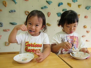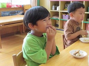11日の午後から上牧公民館で、地域の方々にだんごと味噌だれを作っていただき、12日の午前中に年長児がだんごを串刺ししました。午後からは地域の方々にその五平餅を焼いていただき、みんなでおやつに食べました。五平餅を焼く匂いに誘われて何度も見にくる子、「もう焼けたかな?」と話し合う子など、ワクワクしながら待ちました。とうとう焼き上がり、五平餅をもらうと「ありがとう」と言って嬉しそうにお部屋に戻り美味しそうに食べました。おかわりもいっぱいしました。地域の皆様どうもありがとうございました。