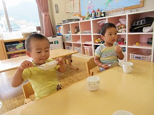 今年度初めてのレストラン給食は、小倉地区の独居老人と高齢者の方々をお招きして、3歳以上児とおしゃべりを楽しみながら一緒に給食を食べていただきました。その後、子育て支援棟に移動し、浴衣に着替えた年長児が講師の先生にお辞儀の仕方やお菓子の運び方など教えていただいた後、少し緊張気味でしたが和菓子とお抹茶をお客様にお運びし、最後に歌のプレゼントをしておもてなしをしました。お客様が帰られた後に、みんなもお菓子とお抹茶をおいしくいただきました。
