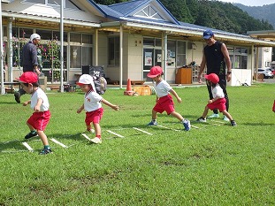 子ども達が楽しみにしていた今年度1回目のサッカー教室。年少児はむねっち先生の話をしっかり聞いてラダーを跳び、ほめられると嬉しそうによりいっそう張り切って飛び跳ねました。年中児、年長児もラダーを跳んだり、ボールを蹴って丸い枠の中で止める練習を真剣に取り組みました。この日、年長児はむねっち先生と一緒に給食を食べ、おしゃべりをして、とても楽しそうでした。