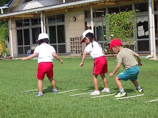 登園してくると先ずはカバンを片付け、園庭や室内で遊びます。砂場で遊ぶ子、「よーいドン」と楽しそうにかけっこをするひよこ組さん。園庭でトンボとりをしながらあそぶ子、お部屋でおしゃべりを楽しんだり、友だちと協力してブロックを組み立てる子、ビーチボールでバレーボールを楽しむ子たち。みんなが元気に登園し楽しく遊ぶ姿に毎日いやされています。
