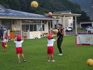 ボールを持ち、友だちにタッチをするゲームではお互いに顔を見合わせて、逃げたり、追っかけたりと楽しく活動しました。とっても楽しかったね!