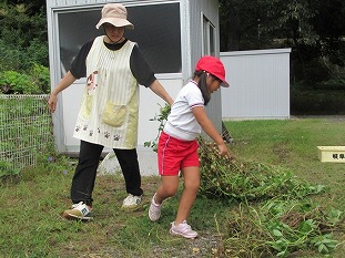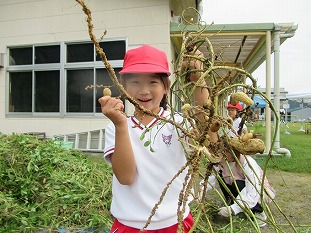 この日はあいにくの雨で畑には行けなかったのですが、地域の方からトラックいっぱいの落花生を頂き、保育園で収穫体験をすることができました。つるを引っ張り上げるとその下にはびっしりと落花生がついていて、子どもたちは「からの中で音がするよ」と教えてくれたり「大きいのがあったよ」と言いながら自慢げに見せてくれました。たくさんの落花生を収穫し、ゆでておやつに食べたり、おみやげで持ち帰りました。貴重な体験をさせていただき、本当にありがとうございました。