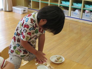 年長児が地域の方に教えていただき、みょうがぼち作りをしました。前もって保育園近くのお宅でみょうがの葉を取らせてもらい、洗って準備万端で挑みました。米粉と小麦粉をお湯でこねた生地であんこを包み、みょうがぼちを作りました。生地を手のひらに乗せてもらうと「あったかい」と言いながらあんこを包んで「できたよ」と嬉しそうにみんなに見せていました。蒸しあがったみょうがぼちは、みんなでおやつにいただき「おいしいね!」とおかわりをして食べました。