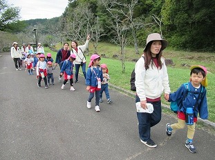 「お弁当をたべましょう」と言うと「やったー」と再び元気に歩き、戸外で美味しそうにお弁当を食べ、総合遊具などで遊び、帰路につきました。楽しかったね(*^-^*)