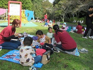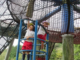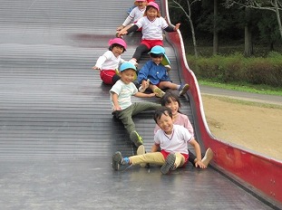 保育園バスで岐阜ファミリーパークスポレクゾーンに遠足に行きました。子どもたちはミラクル広場の遊具にワクワクです。早速リュックを置くと大型遊具に直行。ボールの上をジャンプしたり、ローラースライダーをみんなでつながって滑ったり、網を登って高いところまで行き得意げな顔を見せていました。リュックの中には朝から楽しみにしていたお弁当があり待ちきれない子もいました♪待ちに待ったお弁当を広げると「ハートの卵焼きだよ」「おいしい」などと言いながら、満面の笑みでお弁当を食べていました。午後からも元気いっぱい遊び楽しかったね(*^▽^*)
