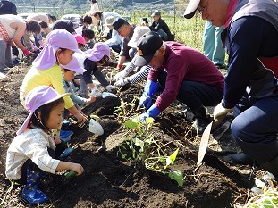 おじいちゃん、おばあちゃんと一緒にさつま芋の苗さしをしました。手で穴を掘り、その穴の中にそっと苗を入れ、土を被せる子どもたち・・・あっという間に90本を植えました。秋の収穫を楽しみに、みんなで「大きくなーれ」とおまじないをかけました。年長さんはこれから水やりを頑張ってね!さつまいもが大きくなる日が待ち遠しいですね。おじいちゃん、おばあちゃん、お手伝いしていただきありがとうございました。