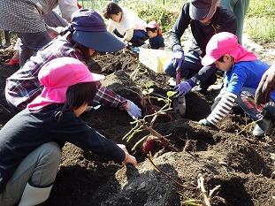 地域の方にお手伝いしていただき、みんなでお芋ほりをしました。手で土を掘りながら芋を見つけると「いもがあったよ!」と嬉しそうに話し、そこから掘り進み芋が抜けると、大喜びで芋を上にかざし、みんなに見せてくれる姿があちこちで見られました。今年はたくさんの収穫があり、みんな最後まで汗をかきながら頑張って掘りました。給食には「さつまいもごはん・さつまいものみそ汁」をいただきました。おいしかったですね(*^-^*)