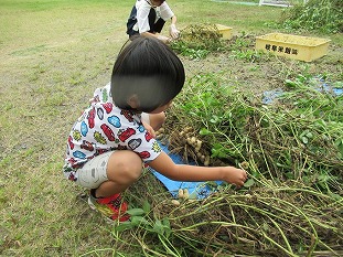 この日はあいにくの雨で畑には行けなかったのですが、地域の方からトラックいっぱいの落花生を頂き、保育園で収穫体験をすることができました。つるを引っ張り上げるとその下にはびっしりと落花生がついていて、子どもたちは「からの中で音がするよ」と教えてくれたり「大きいのがあったよ」と言いながら自慢げに見せてくれました。たくさんの落花生を収穫し、ゆでておやつに食べたり、おみやげで持ち帰りました。貴重な体験をさせていただき、本当にありがとうございました。