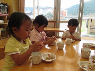 今年度初めてのレストラン給食は、小倉地区の独居老人と高齢者の方々をお招きして、3歳以上児とおしゃべりを楽しみながら一緒に給食を食べていただきました。その後、子育て支援棟に移動し、浴衣に着替えた年長児が講師の先生にお辞儀の仕方やお菓子の運び方など教えていただいた後、少し緊張気味でしたが和菓子とお抹茶をお客様にお運びし、最後に歌のプレゼントをしておもてなしをしました。お客様が帰られた後に、みんなもお菓子とお抹茶をおいしくいただきました。