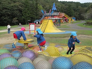 保育園バスで岐阜ファミリーパークスポレクゾーンに遠足に行きました。子どもたちはミラクル広場の遊具にワクワクです。早速リュックを置くと大型遊具に直行。ボールの上をジャンプしたり、ローラースライダーをみんなでつながって滑ったり、網を登って高いところまで行き得意げな顔を見せていました。リュックの中には朝から楽しみにしていたお弁当があり待ちきれない子もいました♪待ちに待ったお弁当を広げると「ハートの卵焼きだよ」「おいしい」などと言いながら、満面の笑みでお弁当を食べていました。午後からも元気いっぱい遊び楽しかったね(*^▽^*)