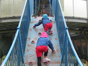 きりん組14名が園バスに乗って各務原公園内にあるパークブリッジに行きました。バスから降りて少し歩くと踏切があり「カンカンカン」と目の前を電車が2台通り過ぎていきました。間近に見る電車に大喜びしながら、パークブリッジに着き、またまた、木製遊具に大喜び。一目散に遊具へとかけて行き、あちらこちらで所狭しとばかり遊びを満喫しました。お弁当は公園の広場で食べ、再びパークブリッジへ・・・