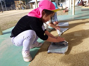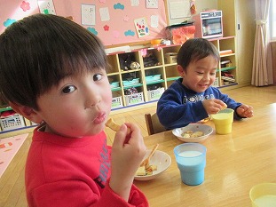 秋に収穫したさつまいもで焼き芋をしました。芋を水で洗い、新聞紙に包みそれを濡らしてアルミホイルに包んで焼き芋の準備ができました。畑でもみ殻を山のように積み燻した中にそっと芋を入れて焼きあがるのを待ちました。「まだかなぁ」「もう焼けたんじゃない?」と何度もテラスに出て、畑の方を見ていましたが、待ちに待った焼き芋を食べた瞬間「あまーい」「おいしい」と満足気でした。