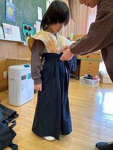 今年度初めてのレストラン給食には乙狩の方々をお招きしました。各クラスに2、3人づつ入って給食を食べていただいてから、支援棟でお茶会を行いました。浴衣に着替えた年長児は「まぁ、かわいい」といってもらうとはにかみながらも笑顔がほころんだところで上井先生からお辞儀の仕方と大切さを教えていただきました。その後に緊張しながらも覚えたてのお運びとお辞儀を上手にし、「ありがとう」「美味しかったよ」と声をかけてもらいうれしそうに戻ってきました。お客様を送った後に子どもたちも和菓子とお抹茶をいただきましたが、「にがい!!」と驚いていました。あと3回あるレストラン給食を通して地域のおじいちゃん、おばあちゃんと楽しい時間を過ごしていこうね。お世話をしてくださった民生委員さん、福祉委員さんありがとうございました。