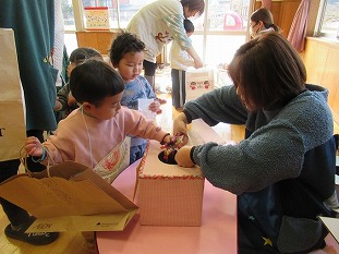 全園児が手作りの鬼のお面を被り遊戯室に集合して、豆まき会をしました。園長先生から節分の話を聞き、裃姿の年長の男の子が舞台の上から無病息災を願って豆まきをしました。その後みんなで豆まきをしているとそこに赤鬼・青鬼が登場!みんなで鬼に豆をまき、鬼を退治しました。給食では『東北東』を向いて恵方巻をパクリ☆これで今年1年元気で過ごせますね!