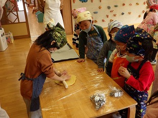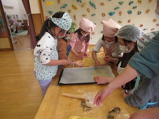 3歳以上児が遊戯室に集まり、クッキー作りをしました。調理員のお姉さんから生地の伸ばし方を教えてもらい、順番にめん棒を使って平らに伸ばすと、いよいよ型抜きです。「わたしはハート」「ぼくはツリー」と自分で好きな型を選び、ぎゅっと生地に押し込みます。上手く型が抜けるとにっこり。天板の上はあっという間にクッキー生地でいっぱいになりました。給食室で焼いてもらうと部屋の中はあまい匂いでいっぱい。どの子も「おいしい」「もっとたべたい!」と言いながら食べ、自分の作ったクッキーに大満足でした。(*^_^*)